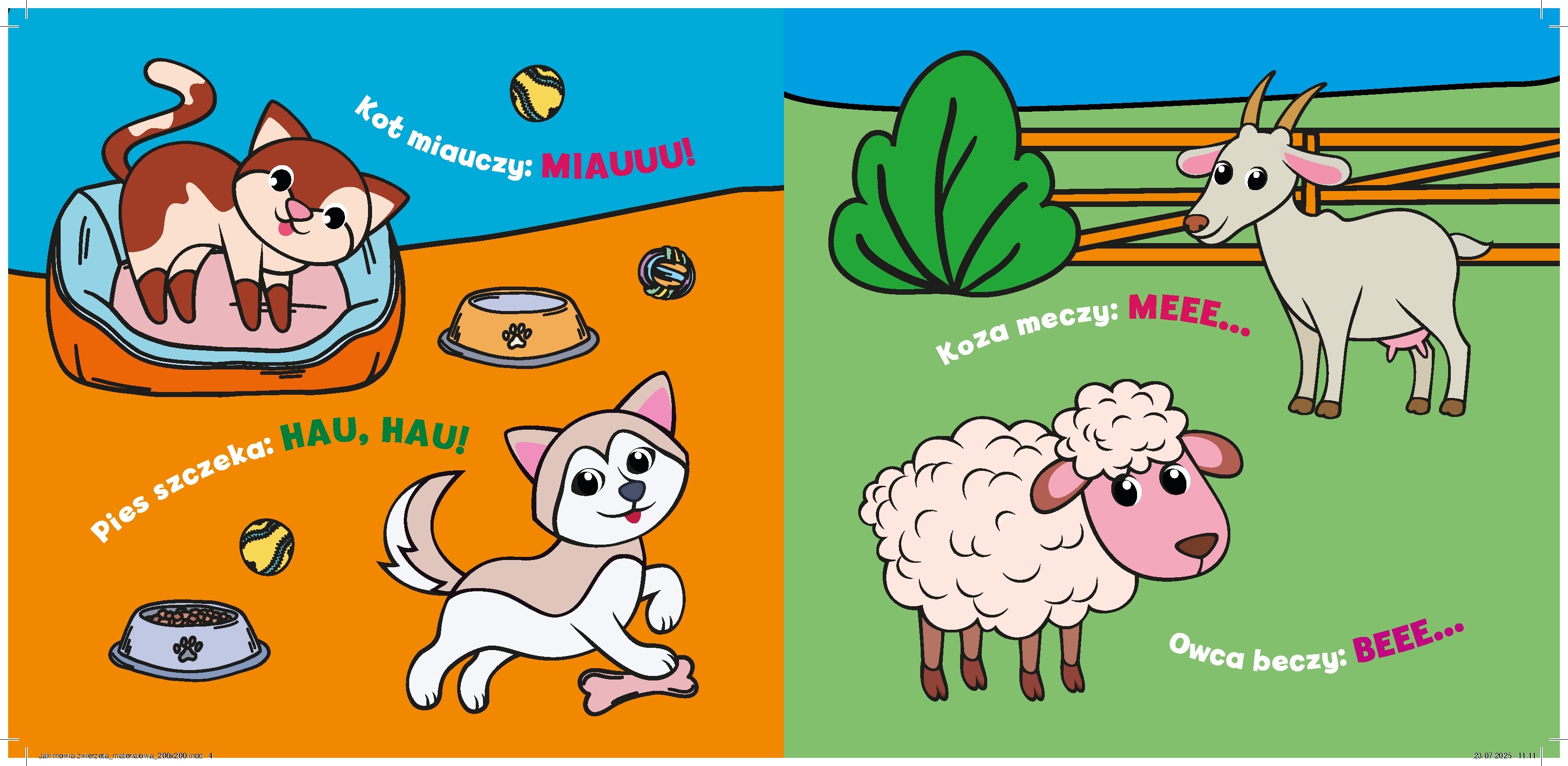 Miękka, lekka i bezpieczna, doskonale sprawdzi się już od pierwszych miesięcy życia. Ma szeleszczące kartki, które wydają delikatne dźwięki i zachęcają malucha do chwytania, ściskania oraz potrząsania. Na stronach znajdują się sympatyczne wiejskie zwierzęta oraz „język” każdego z nich – proste wyrazy dźwiękonaśladowcze, które wspierają rozwój mowy i słuchu. Dzięki kontrastowym, wyraźnym ilustracjom dziecko łatwiej skupia wzrok i poznaje otaczający je świat.