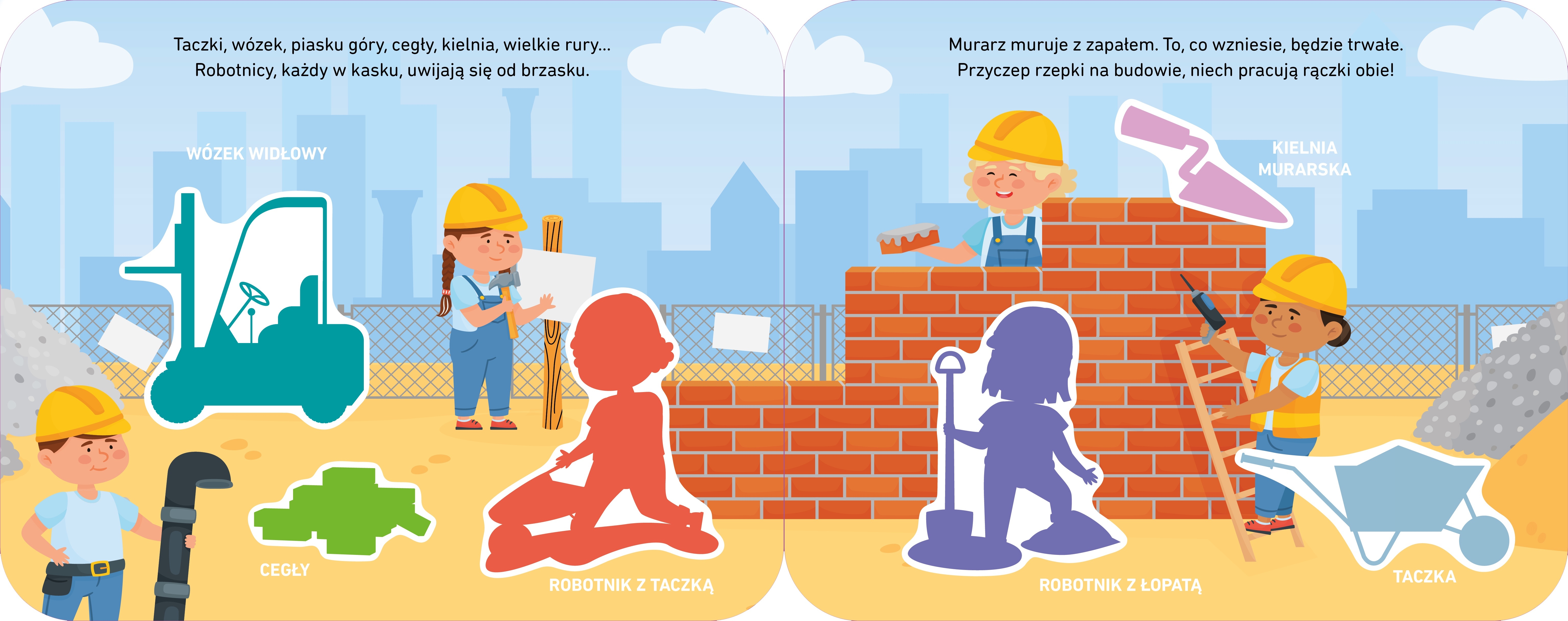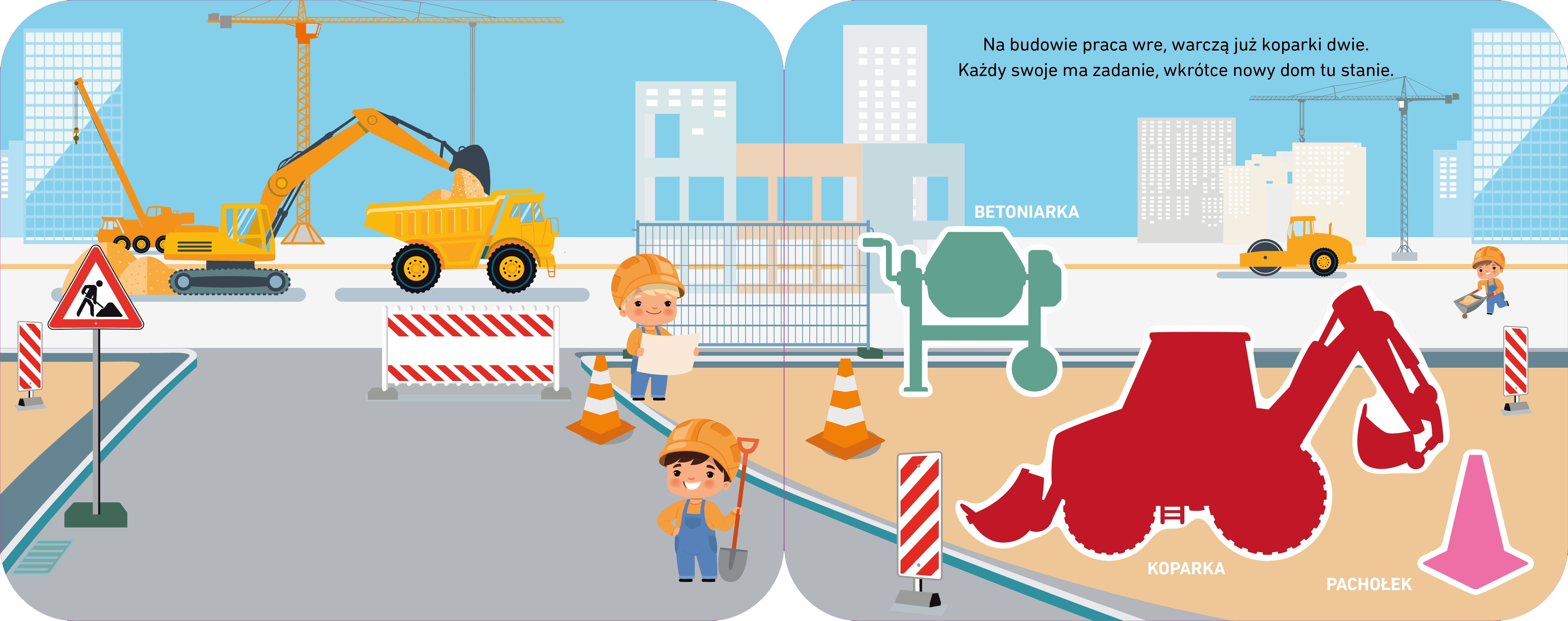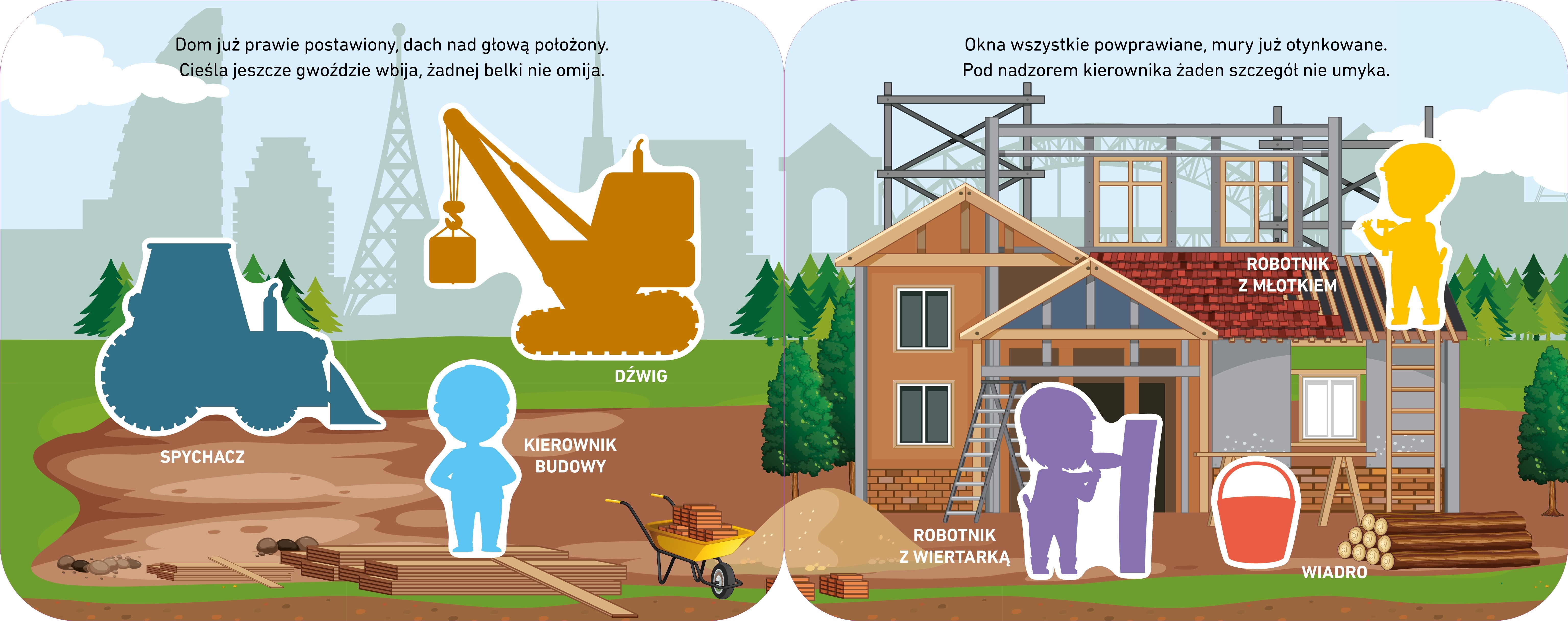 Tu wszystko tętni życiem! Koparki ryczą, walec gładzi świeży asfalt, dźwig podaje belki wysoko pod niebo. Na budowie każdy ma swoje zadanie – murarz, cieśla, malarz i kierownik czuwający nad całością. W tej pełnej rytmu i humoru książeczce mali czytelnicy poznają tajemnice powstawania domu, ucząc się przy tym nazw maszyn i narzędzi.
