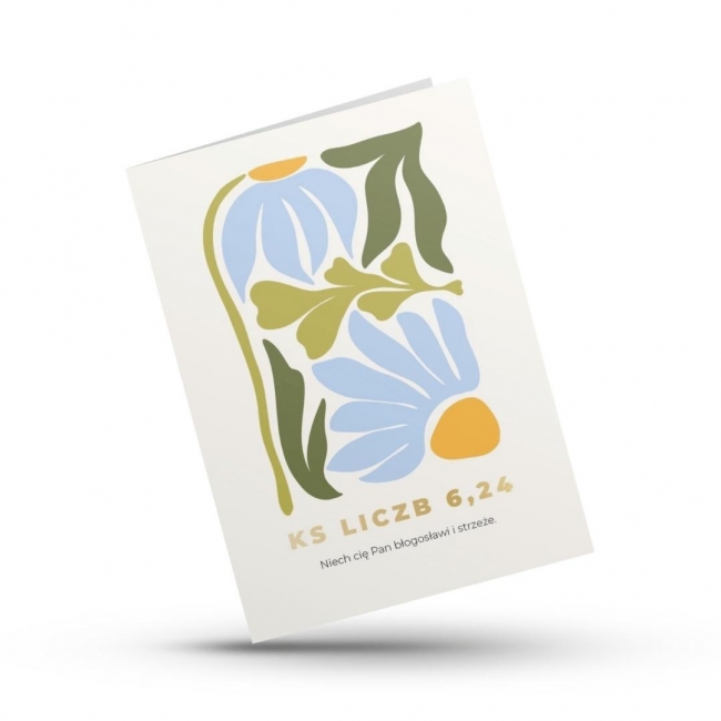 Na okładce znajduje się artystyczny motyw błękitnych kwiatów i zielonych liści. Projekt został wzbogacony eleganckim złoceniem (hot-stamping), które subtelnie podkreśla fragment Pisma Świętego, nadając całości wyjątkowego, szlachetnego charakteru. Kartka doskonale sprawdzi się jako błogosławieństwo w formie upominku, zaproszenie na uroczystość duchową, bądź symboliczna kartka z życzeniami.
