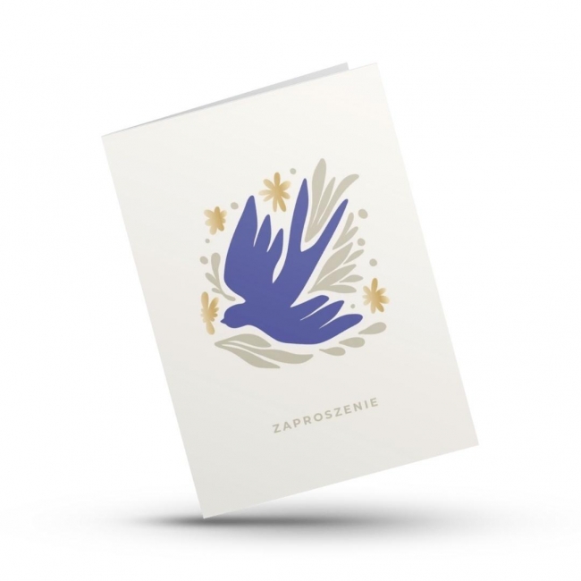 Subtelne i eleganckie zaproszenie z grafiką przedstawiającą gołębicę. Utrzymane w minimalistycznej stylistyce z delikatnymi akcentami błękitu i beżu, ozdobione złoceniem wykonanym metodą hot-stampingu, które dodaje całości wyjątkowego blasku i luksusowego charakteru.