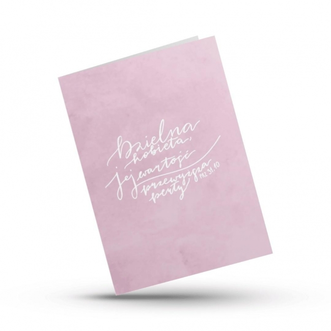 Kartka z cytatem z Księgi Przysłów 31,10. Delikatny różowy kolor i minimalistyczna typografia nadają jej elegancji i subtelności, czyniąc ją idealnym prezentem dla mamy, żony, przyjaciółki czy siostry w wierze.
