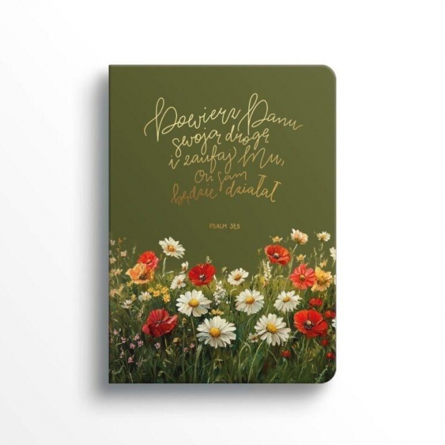 Notatnik Powierz Panu swoją drogę to wyjątkowy notes z ekoskóry inspirowany pięknem natury i treścią Psalmu 37,5. Kwiaty na okładce oraz złocone tłoczenie tworzą elegancki, kojący design, który codziennie przypomina o Bożym prowadzeniu.