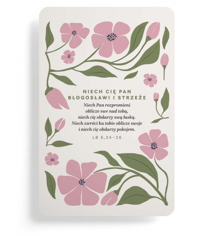 Delikatny magnes z błogosławieństwem z Księgi Liczb 6,24-26. Utrzymany w pastelowych barwach z kwiatowym motywem - przynosi przesłanie pokoju i łaski.