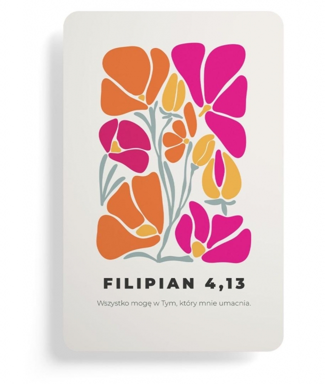 Wyraziste, kwiatowe wzory i werset przypominają o radości i sile płynącej z wiary w Boga, który umacnia każdego dnia.Na magnesie znajduje się tekst: