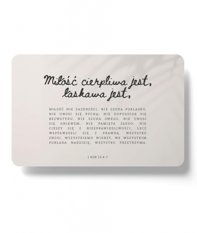 Piękny magnes z cytatem z Pisma Świętego - 1 List do Koryntian 13,4-7. Minimalistyczny, elegancki magnes na lodówkę będzie codziennym przypomnieniem o prawdziwej miłości.