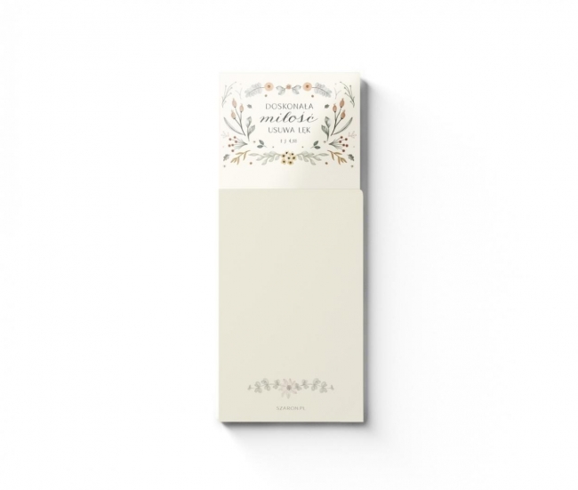 Przedstawiamy elegancki notes z magnesem \"Doskonała miłość\", ozdobiony delikatnym motywem kwiatowym. Jest to doskonały dodatek do Twojego domu lub biura, pozwalający na tworzenie list zakupów, notatek, czy zapisywanie inspirujących cytatów. Dzięki mocnemu magnesowi, łatwo przymocujesz go do lodówki lub innej metalowej powierzchni, zawsze mając go w zasięgu ręki.