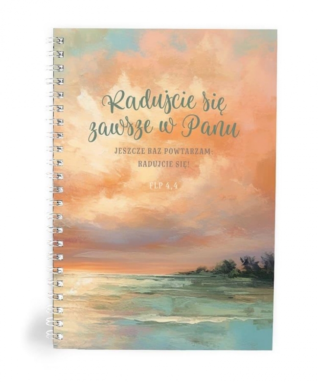 Szukasz notatnika, który codziennie będzie napełniał Cię nadzieją i zachętą? Mój dziennik "Radujcie się zawsze w Panu" to wyjątkowy notes, który przypomina o radości płynącej z bliskości Boga. Na okładce znajduje się piękny fragment z Listu do Filipian (Flp 4,4): "Radujcie się zawsze w Panu. Jeszcze raz powtarzam: radujcie się!". Pastelowa, malarska ilustracja zachodzącego słońca nadaje mu harmonii i lekkości.