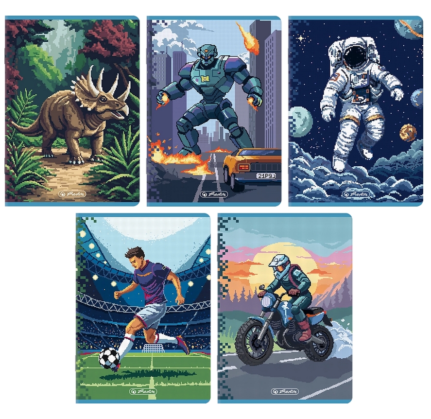Zeszyty Herlitz Pixel Fun to energetyczna i nowoczesna kolekcja stworzona z myślą o młodszych użytkownikach i wszystkich fanach gier komputerowych oraz pikselowej grafiki retro. Okładki zdobią dynamiczne ilustracje w stylu pixel art, przedstawiające m.in. dinozaura, astronautę, sportowca, robota i motocyklistę – pełne kolorów, ruchu i charakteru. Każdy wzór inspirowany jest światem przygód, sportu i technologii, co czyni kolekcję wyjątkowo atrakcyjną i pobudzającą wyobraźnię. Miękkie, kartonowe okładki zostały wykończone matową folią i uszlachetnione wybiórczym lakierem błysk, który podkreśla detale graficzne i nadaje całości efekt trójwymiarowej głębi. Wewnątrz znajduje się papier o gramaturze 70 g/m², idealny do codziennego pisania i rysowania. Zeszyty Herlitz Pixel Fun to doskonałe połączenie jakości, stylu i młodzieżowego charakteru.