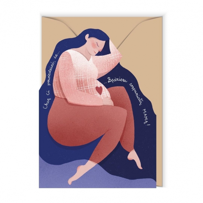 Oryginalna kartka okolicznościowa z wycięciem, która przedstawia kobietę w ciąży i subtelny napis Będziesz wspaniałą mamą. Zaprojektowana przez Justynę Frączek, zachwyca delikatnym i eleganckim designem. Wykonana z wysokiej jakości papieru ekologicznego o dużej gramaturze, łączy trwałość, estetykę i troskę o środowisko. Idealna jako wyjątkowy dodatek do prezentu dla przyszłej mamy pełna ciepła, radości i symbolicznego znaczenia.