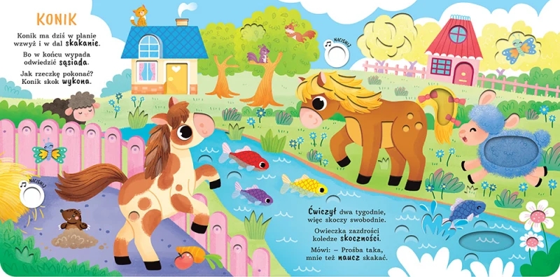 Czekają tu: koniki i owce, świnka i indyczka, kotek i myszki, kogut, kury i kurczęta, krowa, piesek, żabka i królik, a także rodzina kaczek. Posłuchaj odgłosów zwierząt oraz wierszyków, dotknij otworów i sprawdź, jakie rysunkowe niespodzianki kryją się na poszczególnych stronach.