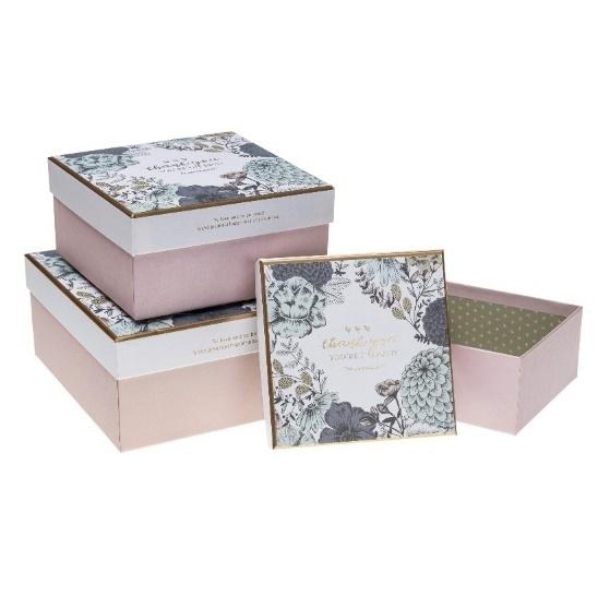 Zestaw pudełek prezentowych z motywem kwiatów.