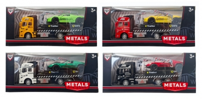 Model ciężarówki z lawetą oraz samochodem sportowym. Zestaw posiada realistyczne detale oraz elementy metalowe. Samochód umieszczony jest na naczepie transportowej, co pozwala na odgrywanie scen przewożenia pojazdów. Produkt występuje w kilku wersjach kolorystycznych, wybierany losowo. Cena dotyczy jednej sztuki. Produkt przeznaczony dla dzieci od 3 lat. Zabawka zapakowana w kartonowe opakowanie. Podane wymiary są wymiarami opakowania.