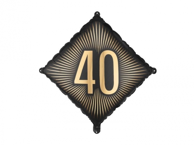 Balon foliowy w kolorze czarnym ze złotym napisem 40 Wymiary przed napompowaniem ok. 54 x 54 cm, wymiary po napompowaniu ok. 46 x 46 cm Do napompowania powietrzem i helem. Zestaw zawiera słomkę.