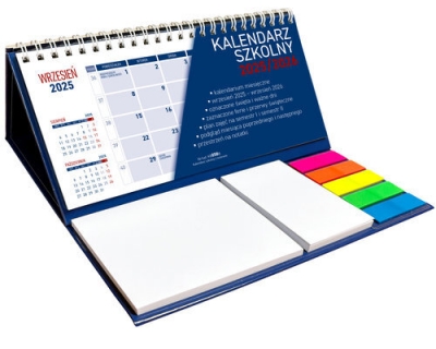 Praktyczny kalendarz szkolny na biurko z przejrzystym kalendarium w układzie trzymiesięcznym. Poręczne samoprzylepne karteczki do notowania.