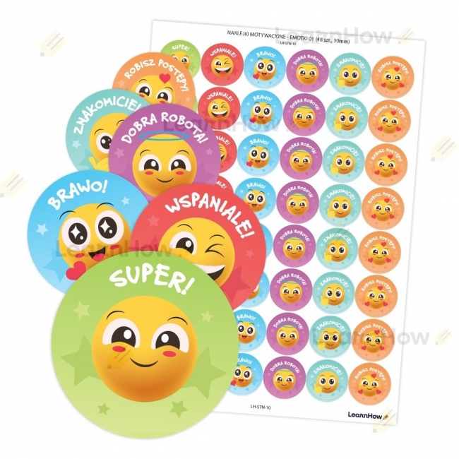 Zestaw 48 naklejek motywacyjnych z uśmiechniętymi emotkami idealne jako pochwała za wykonane zadanie, dobre zachowanie itp.
