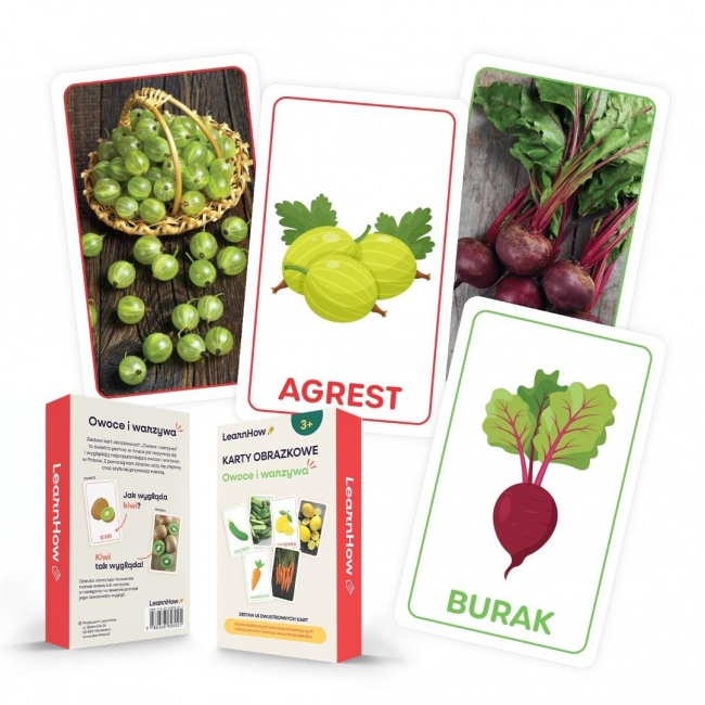 Kolorowe obrazki na pewno zachęcą dziecko do obserwacji i nauki - w zestawie są 23 karty z warzywami oraz 22 karty z owocami.
