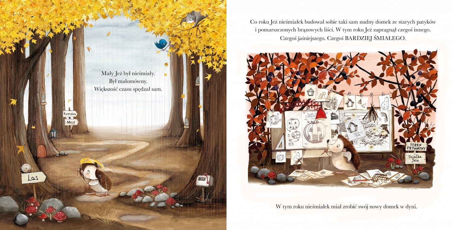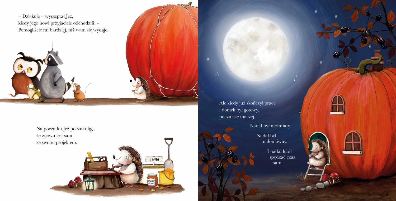 Katy Hudson ze swoim przekornym i uroczym poczuciem humoru przedstawia nam Jeża nieśmiałka, który podjął się przekraczającego – zdawałoby się – jego możliwości, arcyśmiałego planu wybudowania sobie wyjątkowego domku… w ogromnej dyni. Nieśmiałość i brak pewności siebie oraz piętrzące się przeszkody zostają pokonane dzięki przyjaciołom.