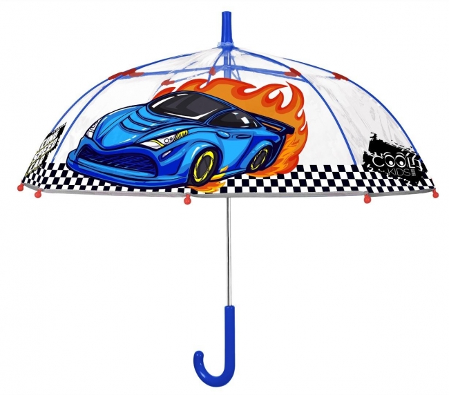 Przezroczysta parasolka dziecięca z motywem samochodu wyścigowego to funkcjonalny i atrakcyjny dodatek na deszczowe dni. Dynamiczna grafika przedstawiająca auto wyścigowe przyciąga uwagę i nadaje parasolce sportowego charakteru. Dodatkowym elementem dekoracyjnym jest wzór szachownicy biegnący wokół czaszy, który nawiązuje do flagi mety i podkreśla wyścigowy styl parasola.