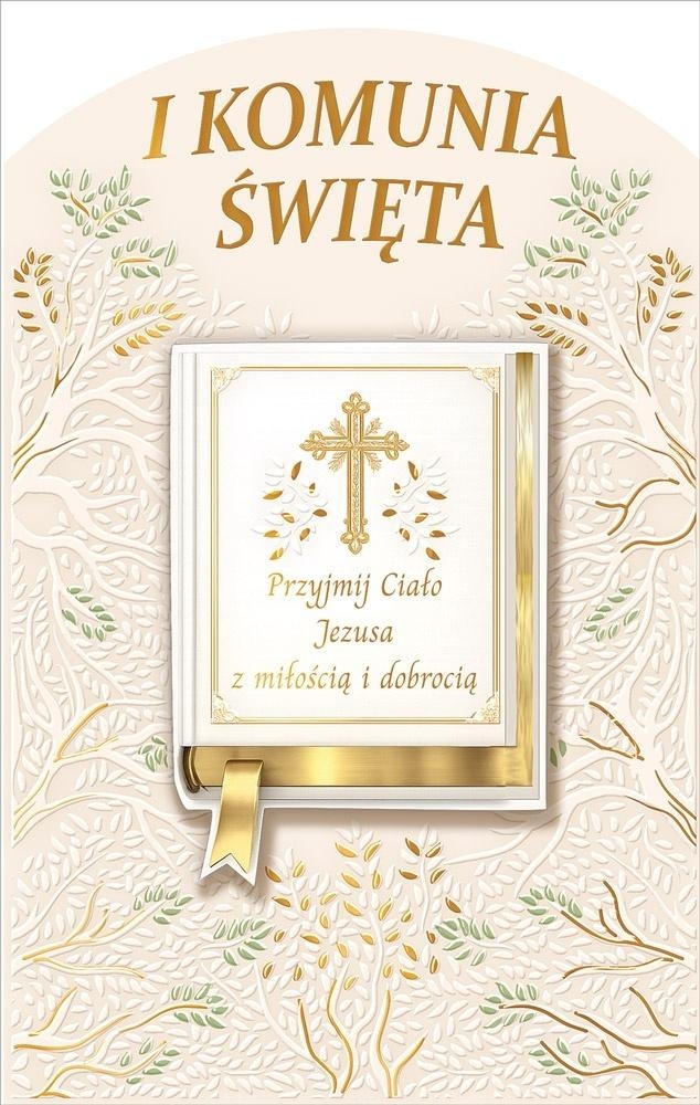 Karnet komunijny, złocony i tłoczony, naklejane elementy, tekst życzeń w środku.