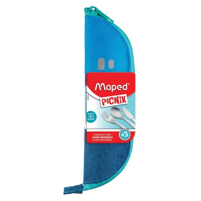 3-częściowy zestaw sztućców Picnik Concept Kids to doskonałe rozwiązanie dla każdego, kto zabiera ze sobą posiłek do szkoły, na pieszą wędrówkę lub piknik. Sztućce zapakowane są w wygodny tekstylny pojemnik, który pozwala utrzymać je zawsze w czystości. Są lekkie i w kompaktowym rozmiarze, swobodnie zmieszczą się w pudełku lunchowym Maped Picnik Concept Kids. Brudne można zamknąć w pudełku obiadowym i zabezpieczyć tym samym inne rzeczy przed zabrudzeniem. Są bardzo poręczne i doskonale leżą w dłoni. Nóż z łatwością poradzi sobie z krojeniem jedzenia.