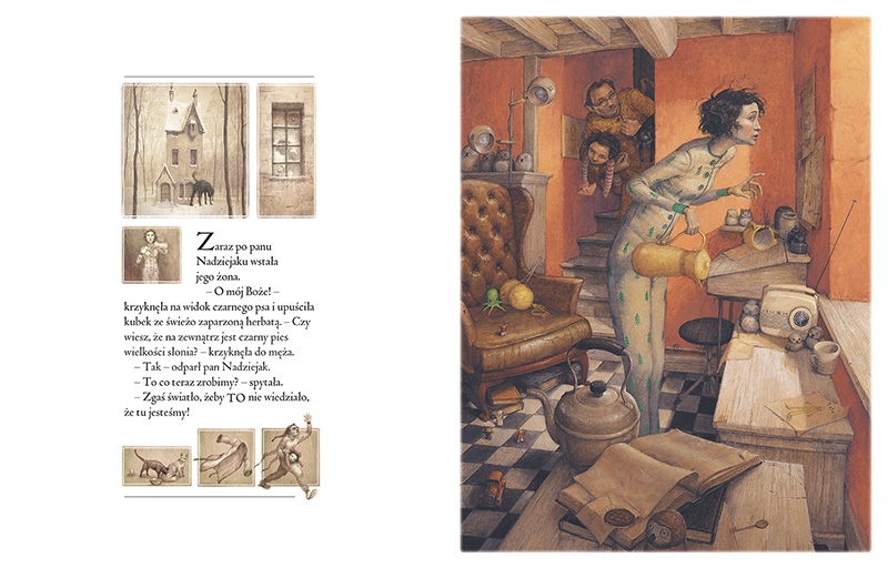 Pewnego poranka rodzinę Nadziejaków odwiedza duży czarny pies. Domownicy obserwują go z okien domu, alarmując o niebezpieczeństwie pozostałych. Tempo rosnącej paniki rodziców i dzieci podkreślają ilustracje, na których realistycznie przedstawiona postać psa z każdą sceną rośnie, przybierając fantastyczny rozmiar wielkiej bestii. Wszystko kończy się dobrze dzięki nieustraszonej postaci Małej, która wolna od uprzedzeń stawia czoło rodzinnym lękom.