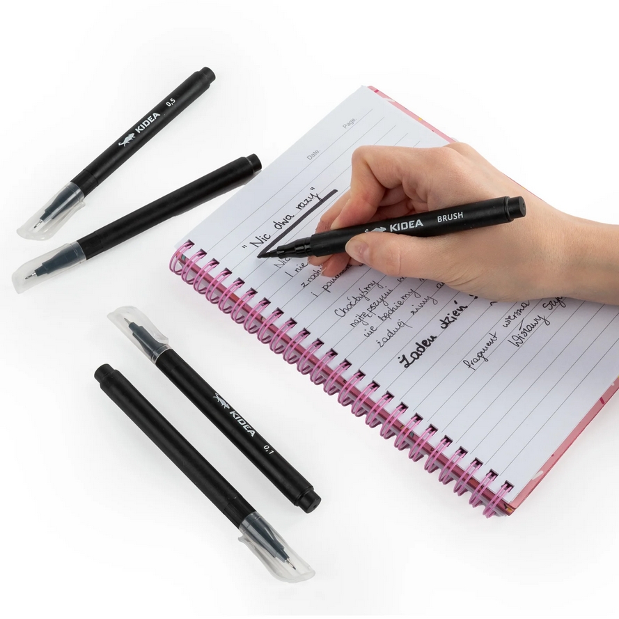 Zestaw obejmuje 6 finelinerów o różnych grubościach, dzięki którym łatwo wykonasz zarówno ultra-precyzyjne detale, jak i mocniejsze kontury. Dostępne końcówki: 0,05 mm, 0,1 mm, 0,3 mm, 0,5 mm, 0,8 mm oraz brush pen – idealny do kaligrafii, dynamicznych pociągnięć i płynnych wykończeń.