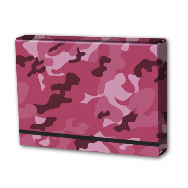 Wykonana z tektury 1,7mm, nitowane boki z okleinowanymi krawędziami, zapinana na płaską gumkę 10 mm . Wzorzysta okleina uszlachetniona błyszczącą folią polipropylenową. Wymiary w cm; 32X23,5X4,5
