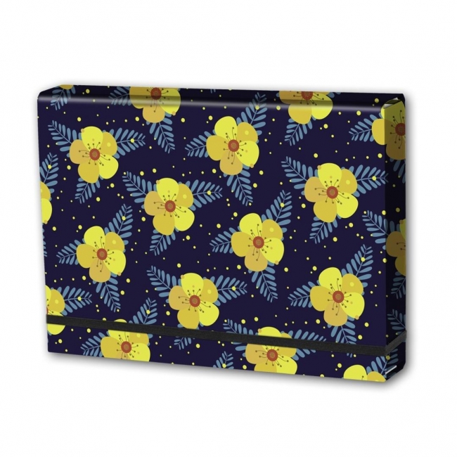Wykonana z tektury 1,7mm, nitowane boki z okleinowanymi krawędziami, zapinana na płaską gumkę 10 mm . Wzorzysta okleina uszlachetniona błyszczącą folią polipropylenową. Wymiary w cm; 32X23,5X4,5