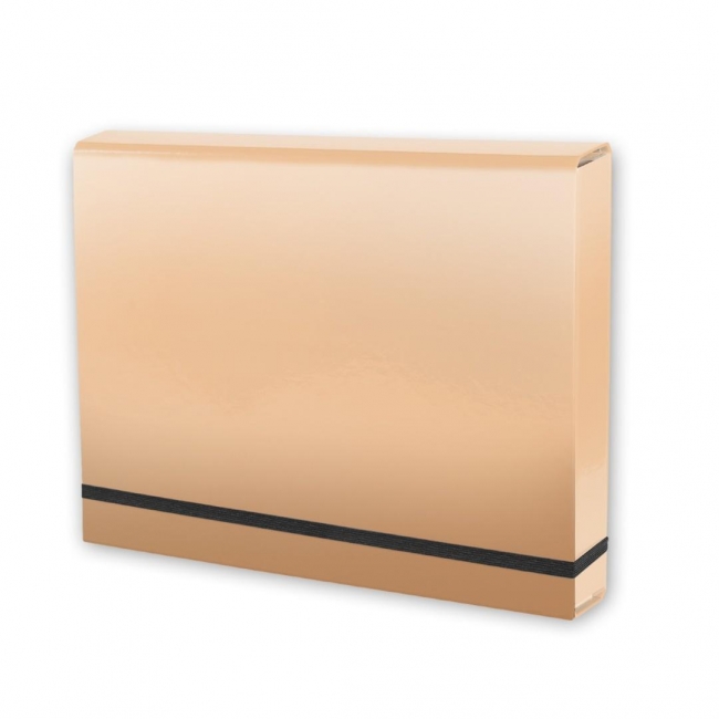 Wykonana z tektury 1,7mm, nitowane boki z okleinowanymi krawędziami, zapinana na płaską gumkę 10 mm. Okleina w jednolitym kolorze uszlachetniona błyszczącą folią polipropylenową. Wymiary w cm; 32X23,5X4,5