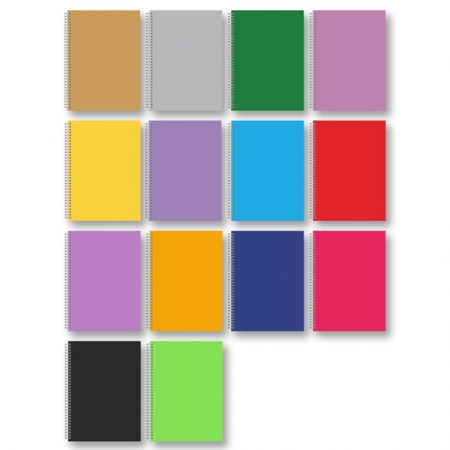 Twarda oprawa z tektury 1,5 mm , gramatura papieru w linię 70 g. Okleina w jednolitym kolorze uszlachetniona błyszczącą folią polipropylenową. Spirala zamocowana na dłuższym boku, kartki z perforacją i otworami do segregatora. Wymiar B5 w cm; 18X25