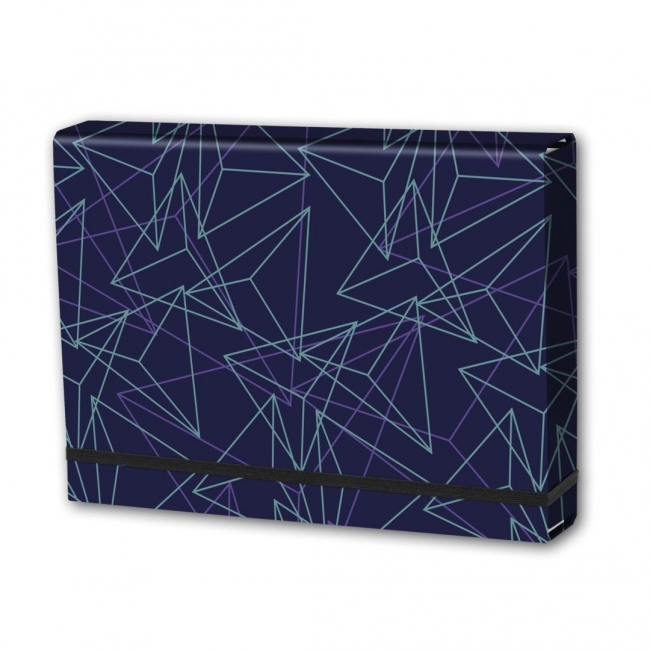 Wykonana z tektury 1,7mm, nitowane boki z okleinowanymi krawędziami, zapinana na płaską gumkę 10 mm . Wzorzysta okleina uszlachetniona błyszczącą folią polipropylenową. Wymiary w cm; 32X23,5X4,5