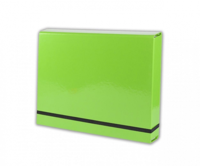 Wykonana z tektury 1,7mm, nitowane boki z okleinowanymi krawędziami, zapinana na płaską gumkę 10 mm. Okleina w jednolitym kolorze uszlachetniona błyszczącą folią polipropylenową. Wymiary w cm; 32X23,5X4,5