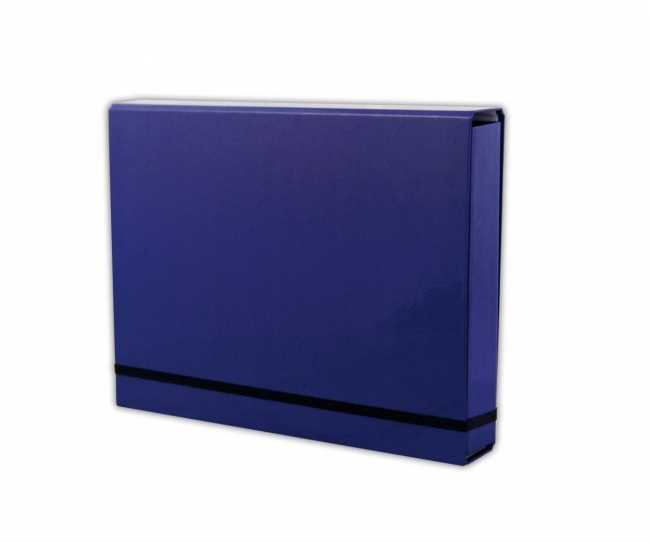 Wykonana z tektury 1,7mm, nitowane boki z okleinowanymi krawędziami, zapinana na płaską gumkę 10 mm. Okleina w jednolitym kolorze uszlachetniona błyszczącą folią polipropylenową. Wymiary w cm; 32X23,5X4,5