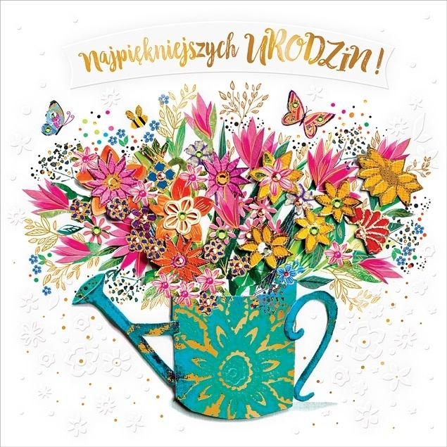 Karnet urodzinowy, złocony i tłoczony, tekst życzeń w środku.
