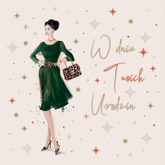 Karnet urodzinowy, złocony i tłoczony, tekst życzeń w środku.