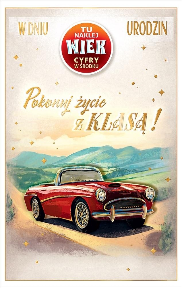 Karnet urodzinowy z życzeniami w środku, złocenie, naklejane elementy oraz naklejki z cyframi do personalizacji wieku