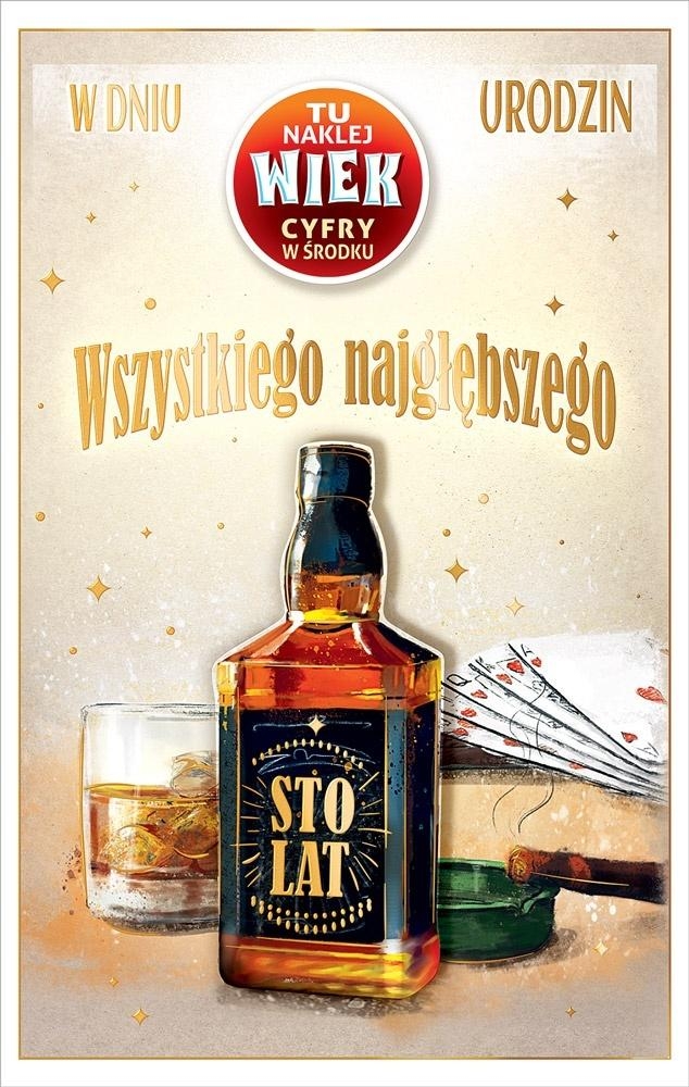 Karnet urodzinowy z życzeniami w środku, złocenie, naklejane elementy oraz naklejki z cyframi do personalizacji wieku