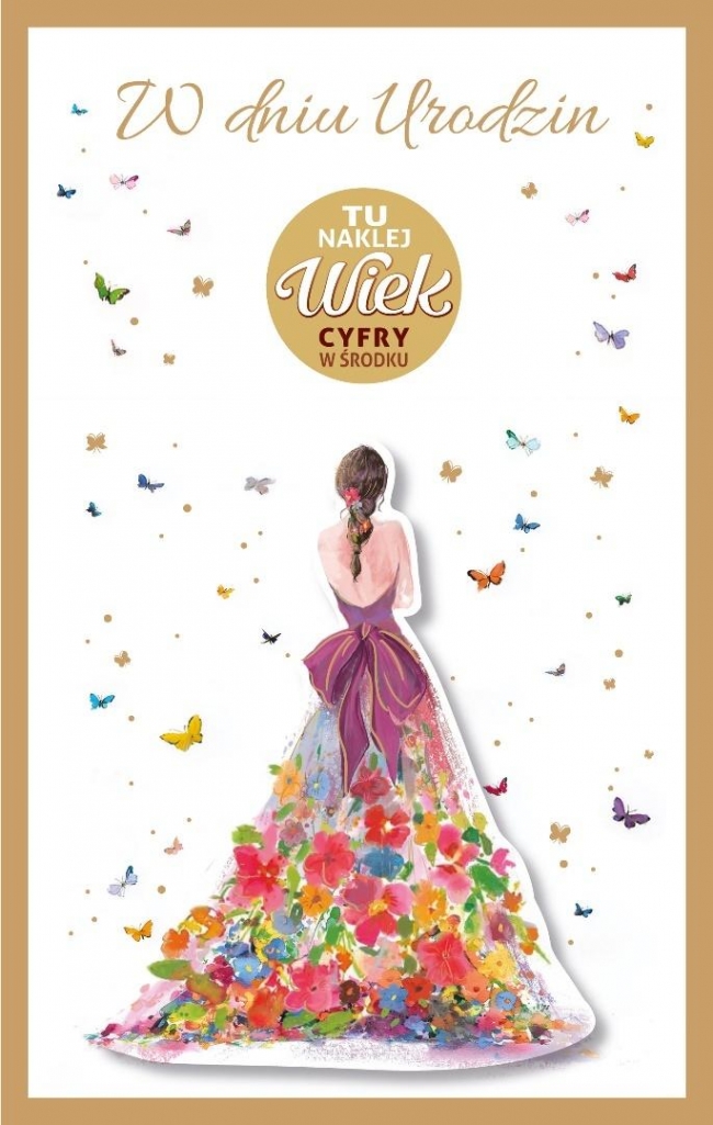 Karnet urodzinowy z życzeniami w środku, złocenie, naklejane elementy oraz naklejki z cyframi do personalizacji wieku