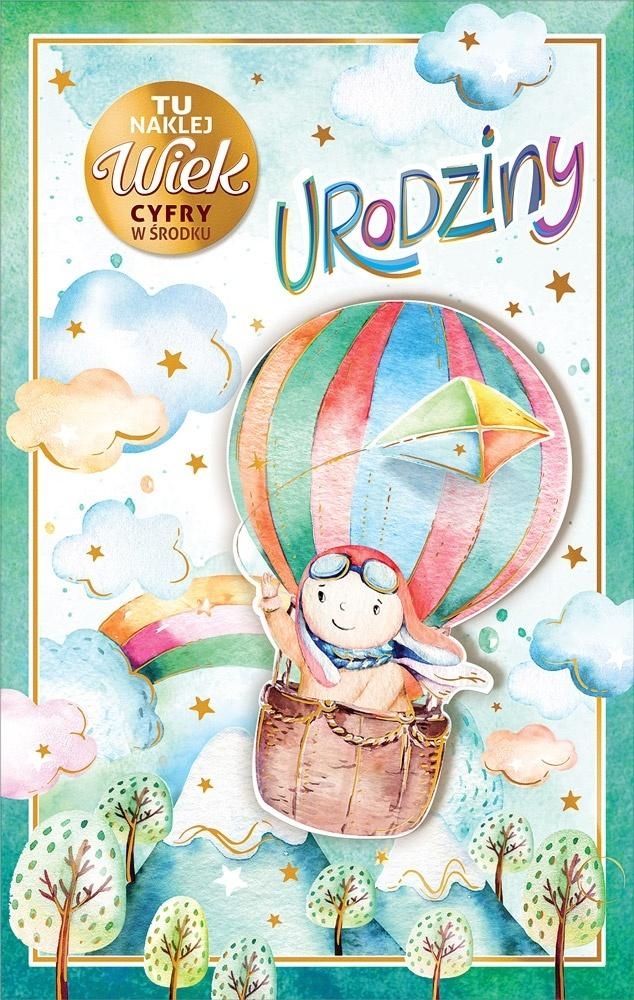 Karnet urodzinowy z życzeniami w środku, złocenie, naklejane elementy oraz naklejki z cyframi do personalizacji wieku