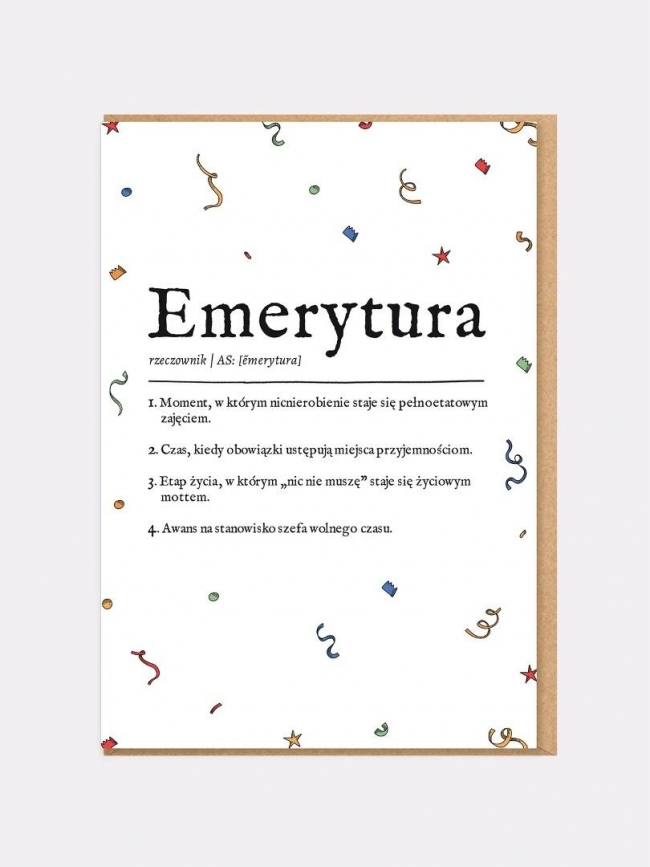 Typograficzny projekt inspirowany hasłem słownikowym oraz kolorowe, konfettiowe akcenty nadają kartce radosny charakter. To idealna kartka z okazji przejścia na emeryturę, która łączy dystans, poczucie humoru i elegancką prostotę.