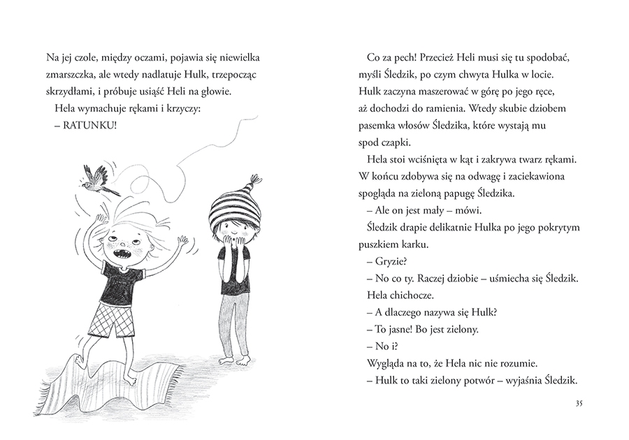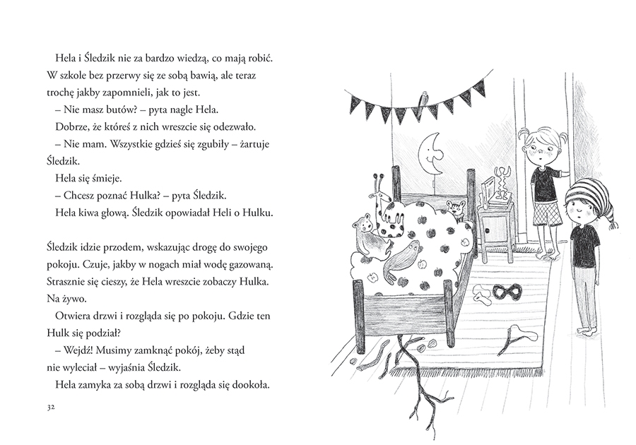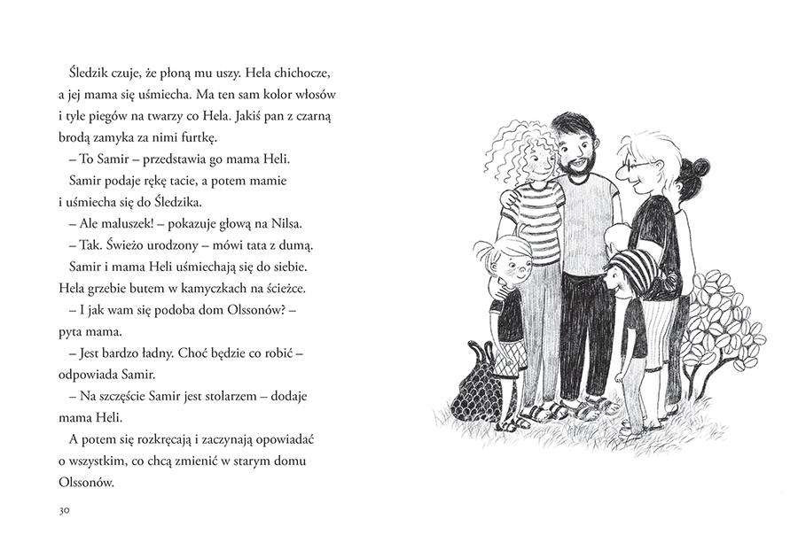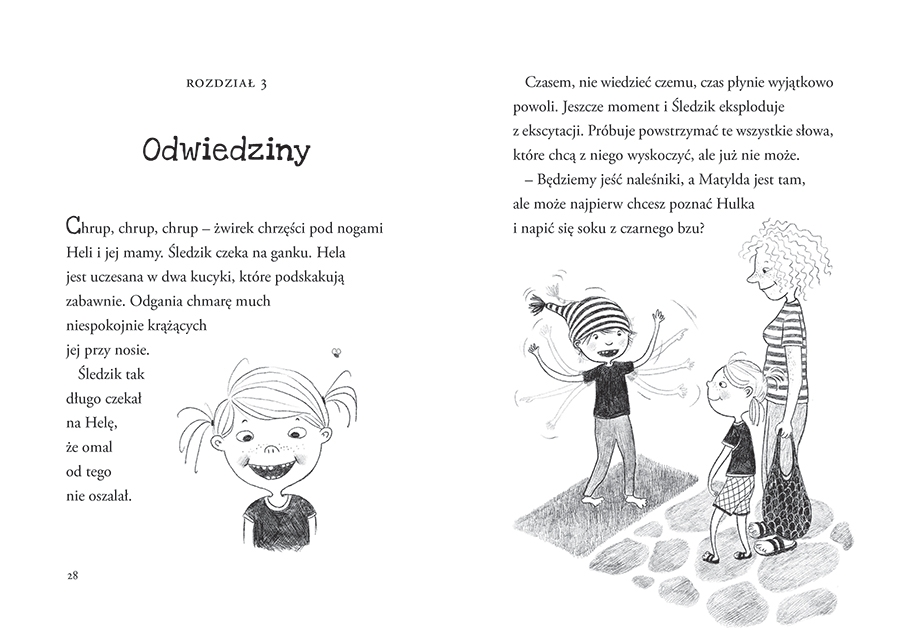 Śledzik i Hela polubili się już pierwszego dnia w szkole. A niedługo może zostaną sąsiadami? Stary dom Olssonów stoi pusty, więc rodzina Heli mogłaby się tam wprowadzić. Jeśli tylko Heli spodoba się na wsi. Śledzik musi się postarać, żeby tak właśnie było. Pokaże Heli wszystko, zwłaszcza zwierzęta. Ale to właśnie przez zwierzęta sprawa zaczyna się komplikować. Bo bardzo ich na wsi dużo, a do tego bzyczą, gryzą i zostawiają na polu placki… Co na to Hela?