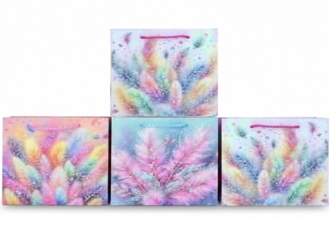 Podkreśl wyjątkowość wręczanego prezentu dzięki torebce, która sama w sobie stanowi zachwycającą dekorację. Zaprojektowana z myślą o miłośnikach subtelnej elegancji, prezentuje marzycielski motyw kolorowych piór wykonany w malarskim stylu akwarelowym. Płynne przejścia między odcieniami błękitu, różu i fioletu, przeplatane świetlistymi akcentami i delikatnymi drobinkami przypominającymi gwiezdny pył, tworzą efekt niezwykłej lekkości i magii. Wytrzymałe, kolorowe sznurki pełniące rolę uchwytów zapewniają komfort noszenia i idealnie komponują się z całością projektu. To doskonały wybór na urodziny, jubileusze czy uroczystości dla dzieci, gdzie estetyka opakowania ma za zadanie zapowiedzieć radosną zawartość i wywołać uśmiech na twarzy obdarowanej osoby jeszcze przed otwarciem upominku.