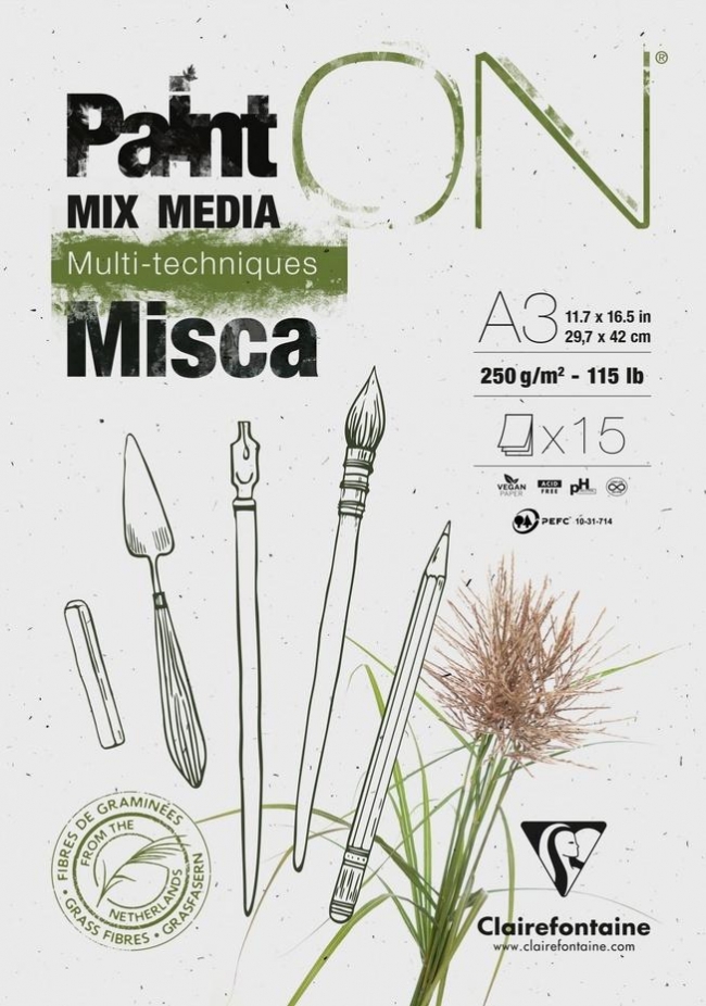 Papier Paint`ON(R) do różnych technik malarskich (Mix-Media), produkowany z ozdobnej, szybko rosnącej trawy zwanej Miskant (Miscanthus) zbieranej między innymi w Holandii.
