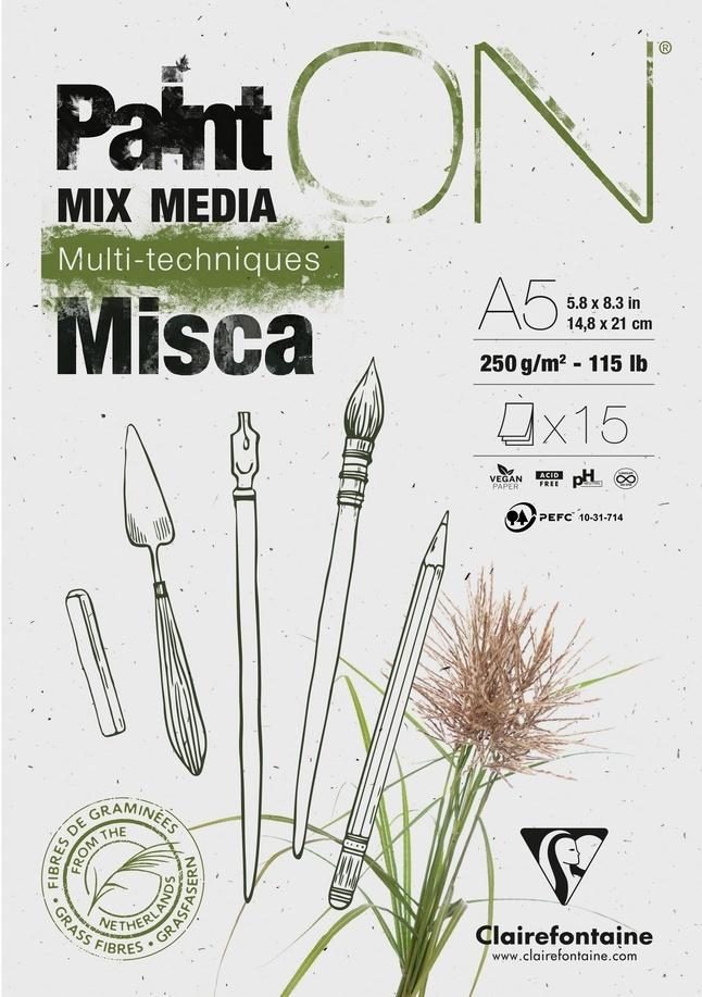 Papier Paint`ON(R) do różnych technik malarskich (Mix-Media), produkowany z ozdobnej, szybko rosnącej trawy zwanej Miskant (Miscanthus) zbieranej między innymi w Holandii.