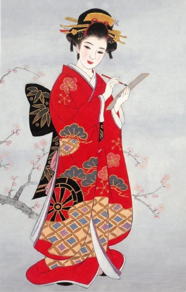 Przedstawia portret młodej kobiety (gejszy/maiko) w bogato zdobionym czerwonym kimonie, z tradycyjną fryzurą i ozdobami. Kobieta trzyma pędzel i kartkę, w skupieniu oddając się pisaniu lub kaligrafii. Delikatne gałązki kwitnącej wiśni dodają kompozycji subtelnego, poetyckiego charakteru. Karnet w zestawie z kopertą, bez tekstu w środku.