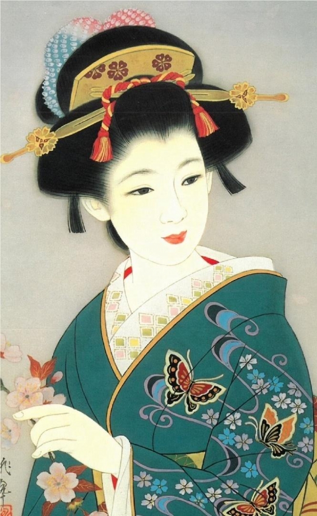 Elegancki japoński karnet premium z piękną, artystyczną ilustracją.Przedstawia portret młodej kobiety (gejszy/maiko) w bogato zdobionym zielonym kimonie z motywem motyli. Kobieta ma klasyczną, wyszukaną fryzurę z tradycyjnymi ozdobami i koto. Delikatny, subtelny uśmiech oraz elegancka poza nadają ilustracji wyjątkowego uroku. Kompozycję wzbogacają motyle oraz delikatne gałązki kwitnącej wiśni, które dodają całości poetyckiego i eterycznego charakteru.Karnet w zestawie z kopertą, bez tekstu w środku.