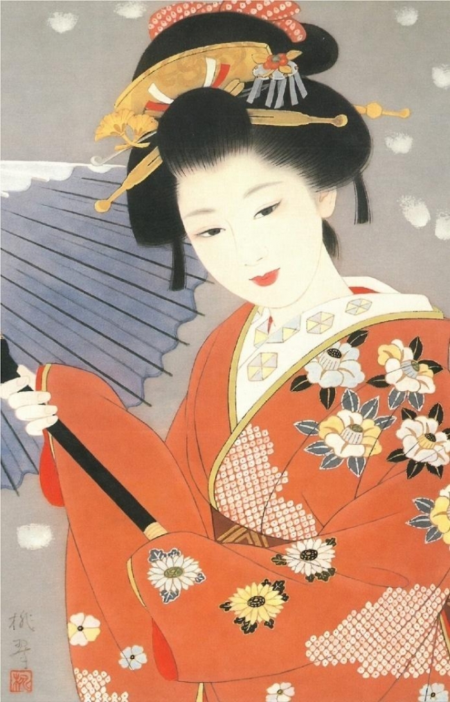 Elegancki japoński karnet premium z piękną, artystyczną ilustracją.Przedstawia portret młodej kobiety (gejszy/maiko) w bogato zdobionym czerwonym kimonie z motywem kwiatów. Kobieta trzyma w dłoniach elegancki granatowy parasol, ma klasyczną, wyszukaną fryzurę z tradycyjnymi ozdobami i koto. Delikatny, subtelny uśmiech oraz elegancka, lekko zwrócona poza nadają ilustracji wyjątkowego uroku i wdzięku. Karnet w zestawie z kopertą, bez tekstu w środku.