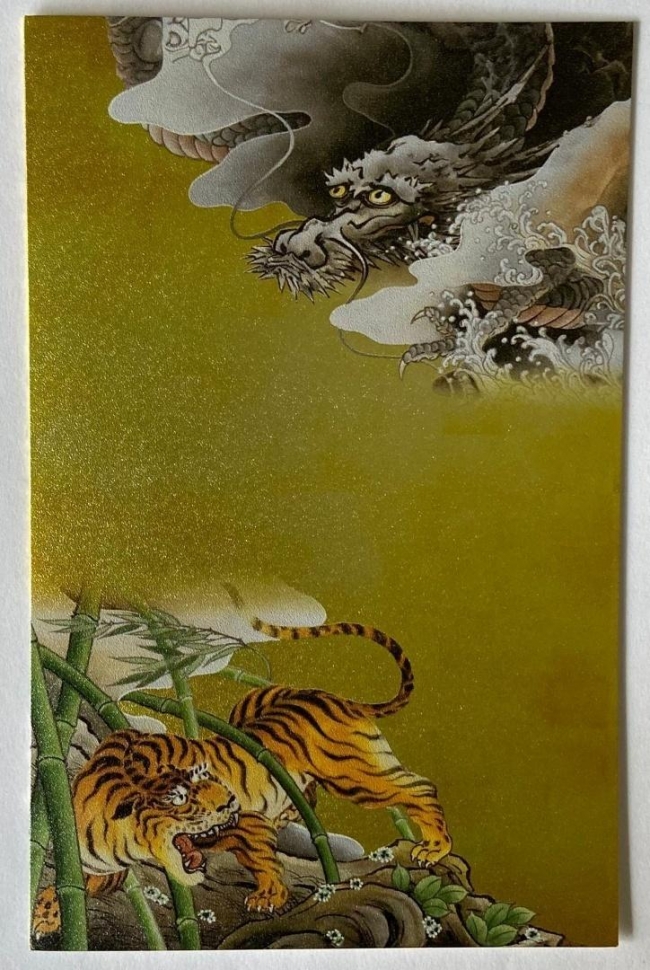Elegancki japoński karnet premium z piękną, artystyczną ilustracją. Przedstawia dynamiczną i pełną mocy scenę na złotym tle. W centrum kompozycji znajduje się potężny tygrys w dynamicznej pozie, stojący wśród zielonego bambusu. Nad nim unosi się majestatyczny smok wijący się wśród chmur i mgieł. Ilustracja łączy siłę i grację tygrysa z mistyczną aurą smoka, tworząc klasyczną, symboliczną kompozycję nawiązującą do tradycyjnych motywów japońskiej i chińskiej sztuki. Karnet w zestawie z kopertą, bez tekstu w środku.