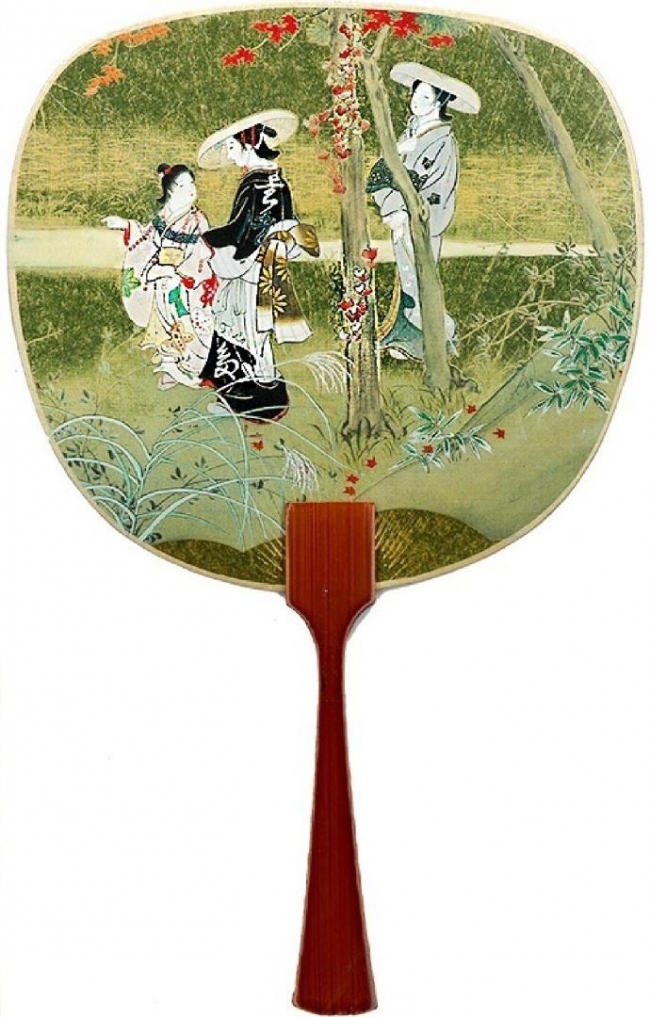 Elegancki japoński karnet premium z piękną, artystyczną ilustracją. Przedstawia tradycyjny japoński wachlarz (uchiwa) w złocisto-żółtym kolorze. Na powierzchni wachlarza znajduje się delikatna, malownicza scena w stylu ukiyo-e. Dwie eleganckie kobiety w tradycyjnych kimonach spacerujące po polu lub ogrodzie wśród traw i kwitnących drzew. Karnet w zestawie z kopertą, bez tekstu w środku.