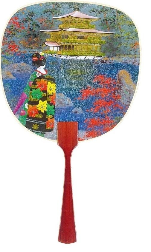 Elegancki japoński karnet premium z piękną, artystyczną ilustracją. Przedstawia tradycyjny japoński wachlarz (uchiwa) w żywych, letnich barwach. Na powierzchni wachlarza znajduje się kolorowa, impresjonistyczna scena przedstawiająca krajobraz z pagórkami, zielonymi polami oraz intensywnymi czerwonymi i żółtymi kwiatami w pierwszej planie. Karnet w zestawie z kopertą, bez tekstu w środku.